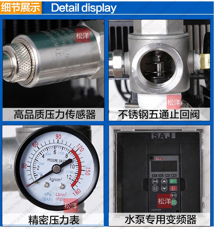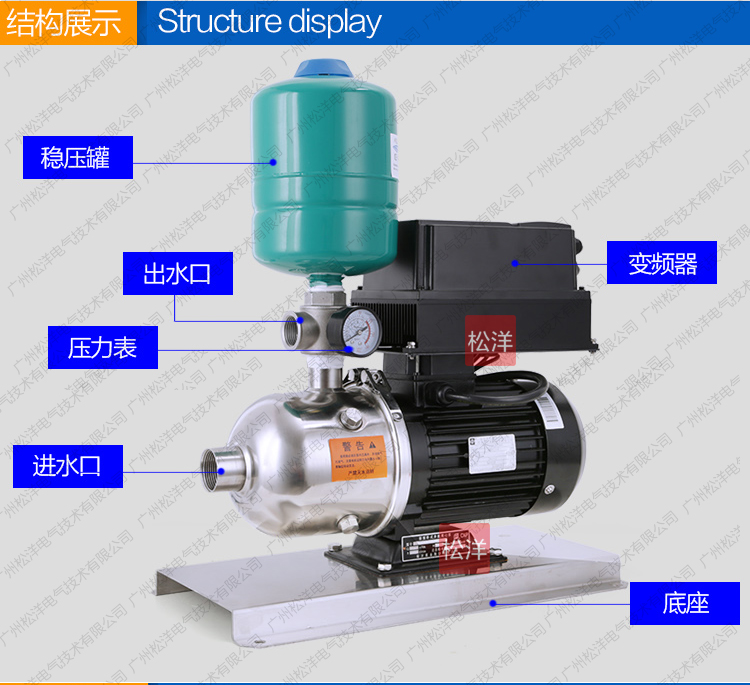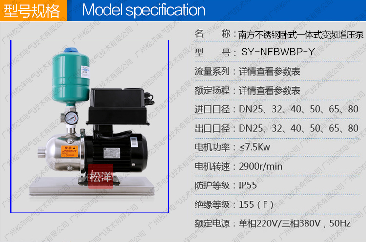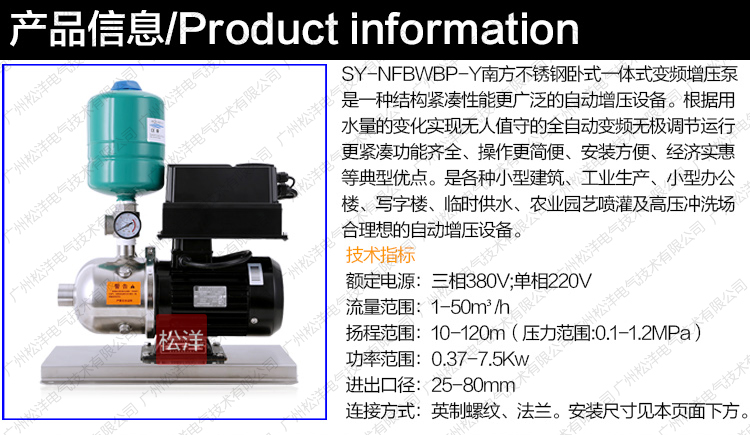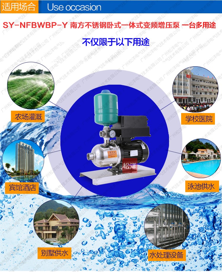 SY-NFBWBP-Y南方不銹鋼臥式一體式變頻增壓泵是一種 結構緊湊性能更廣泛的自動增壓設備。根據用水量的變化 實現無人值守的全自動變頻無極調節運行。更緊湊功能齊 全、操作簡便、安裝方便、經濟實惠等典型優點。是各種 小型建筑、工業生產、小型辦公樓、寫字樓、臨時供水、 農業園藝噴灌及高壓沖洗場合理想的自動增加設備。