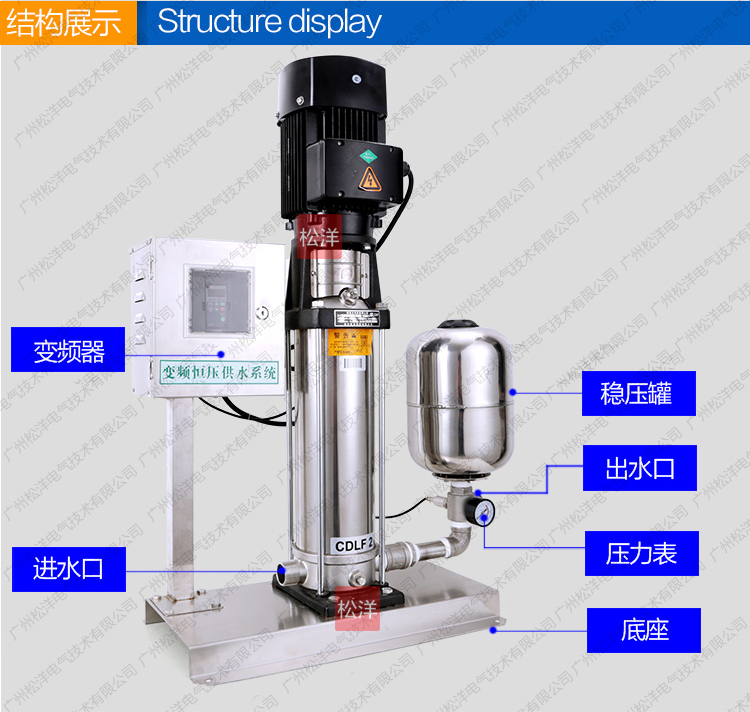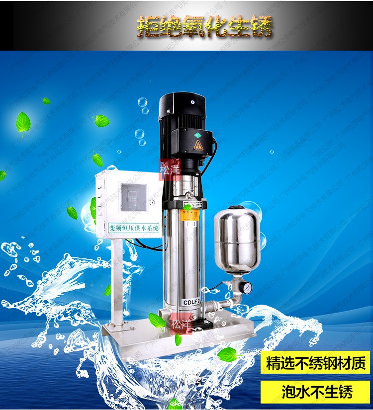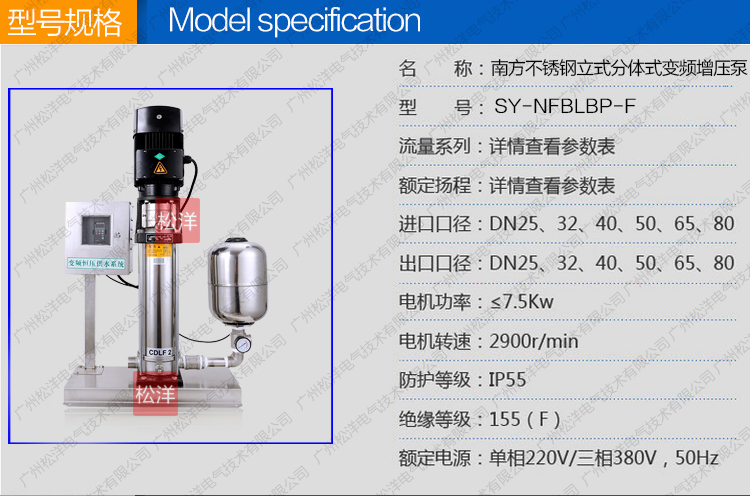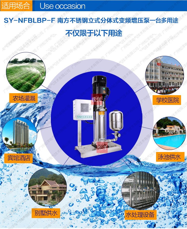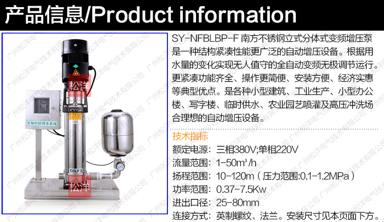 SY - NFBLBP-F南方不銹鋼立式分體式變頻增壓泵是一種 結構緊湊性能更廣泛的自動增壓設備。根據用水量的變化 實現無人值守的全自動變頻無極調節運行。更緊湊功能齊 全、操作簡便、安裝方便、經濟實惠等典型優點。是各種 小型建筑、工業生產、小型辦公樓、寫字樓、臨時供水、 農業園藝噴灌及高壓沖洗場合理想的自動增加設備。