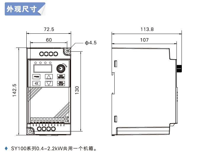 SY100系列變頻器基于松洋公司多年的變頻器研發經驗,是我司推出的一款簡易經 濟型變頻器,具有性價比。該款變頻器結構設計輕盈小巧,滿足導軌和螺絲固定兩 種安裝方式,硬件及軟件設計充分考慮了產品在實際應用中的過熱、過載等需求,滿 足工業現場的應用。